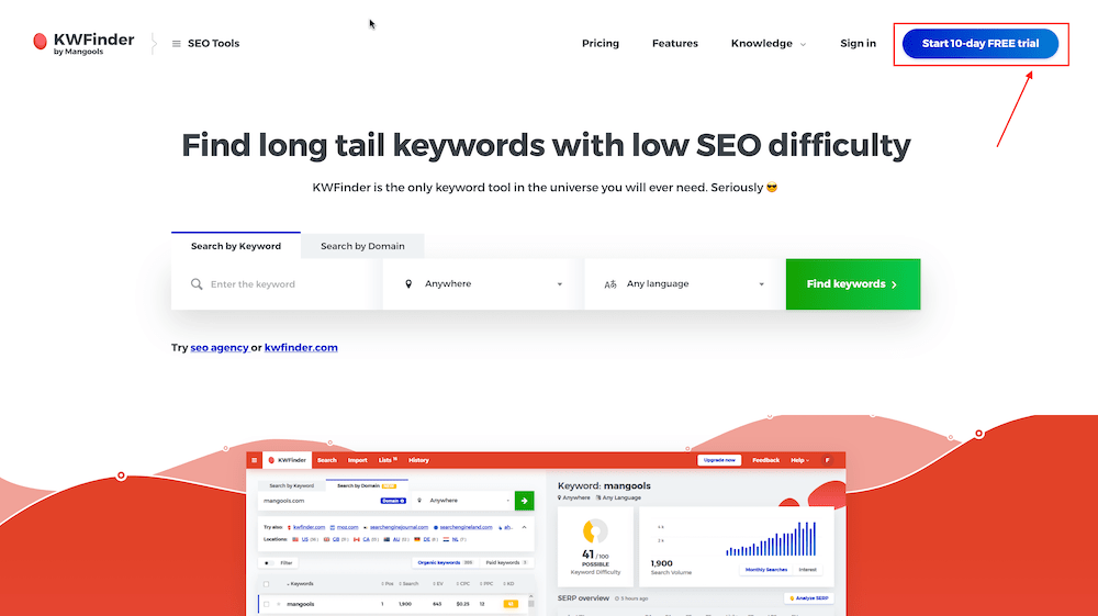 در ابتدا وارد سایت https://kwfinder.com بشوید و مانند تصویر زیر روی گزینه Start 10-day FREE trial کلیک کنید.