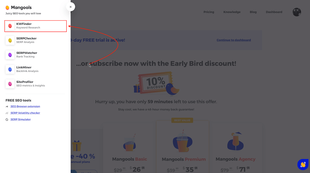 بعد از کلیک روی لینک فعال سازی ایمیل وارد صفحه زیر می شود. از منوی سمت چپ روی گزینه KWFinder کلیک کنید تا وارد ابزار KWFinder بشوید.
